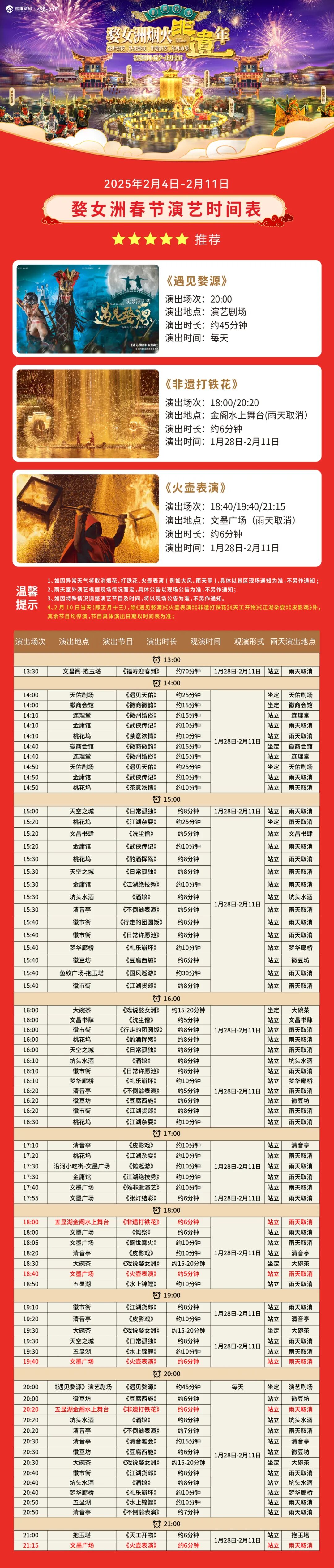出門旅游怎能不拍照呢?婺咖、南墻、茶館……超多打卡點(diǎn),包出片的!不再害怕一房難求!茶圣精舍、無夢(mèng)酒店、水上民宿……在山水間酣然入夢(mèng)!花有約,春不誤,婺女洲梅花即將進(jìn)入最佳觀賞期,花期從二月初持續(xù)到二月底。 ▼婺女洲2月4日-2月11日演藝時(shí)間表▼
