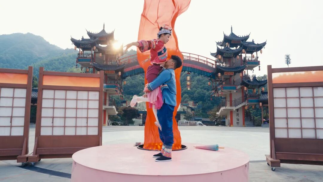 畬族定情之舞:月娥手持甲路傘從摘星樓翩然而下,與世昌上演高空雙人雜技,彩帶飛舞間演繹“三生三世不分離”的諾言;
