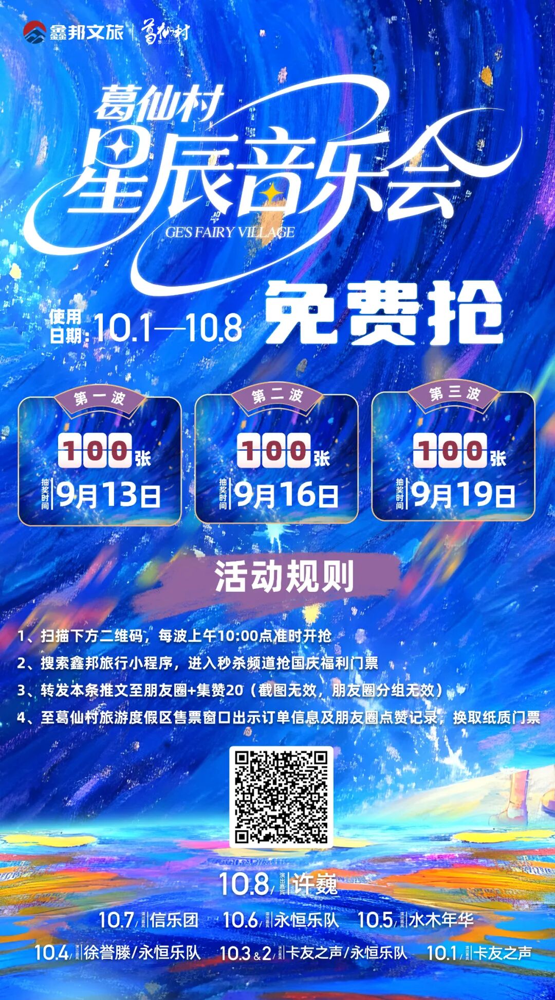 9月13日、9月16日、9月19日,鎖定每波上午10點,葛仙村門票限時免費搶!搶到立省130元!10月1日至10月8日,葛仙村「星辰音樂會」許巍、水木年華、信樂團……帶你重溫經(jīng)典、嗨唱全場!